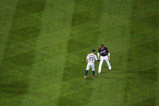 Houston Astros' Jose Altuve talks to Washington Nationals' Juan Soto before Game 3 of the baseball World Series between the Houston Astros and the Washington Nationals Friday, Oct. 25, 2019, in Washington. (AP Photo/Will Newton, Pool) The Associated Press