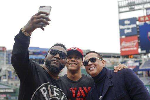 Alex Rodriguez and David Ortiz take a selfie with Washington Nationals' Juan Soto before Game 3 of the baseball World Series against the Houston Astros Friday, Oct. 25, 2019, in Washington. (AP Photo/Pablo Martinez Monsivais) The Associated Press