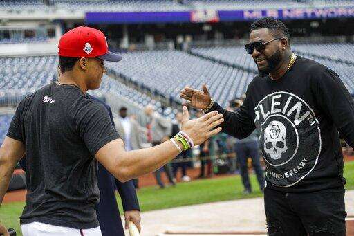 David Ortiz talks to Washington Nationals' Juan Soto before Game 3 of the baseball World Series against the Houston Astros Friday, Oct. 25, 2019, in Washington. (AP Photo/Pablo Martinez Monsivais) The Associated Press