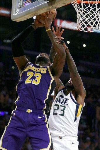 Los Angeles Lakers forward LeBron James, left, goes up next to Utah Jazz forward Royce O'Neale, right, during the second half of an NBA basketball game in Los Angeles, Friday, Oct. 25, 2019. (AP Photo/Alex Gallardo) The Associated Press