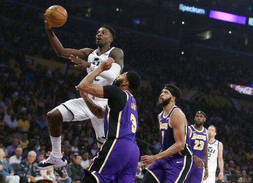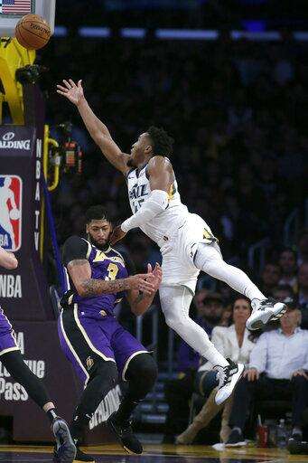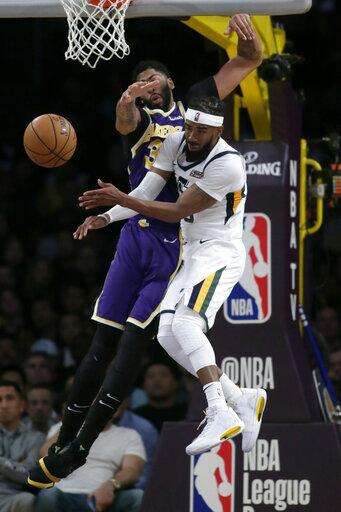 Utah Jazz guard Mike Conley (10) collides with Los Angeles Lakers forward Anthony Davis (3) while making a pass under the rim during the second half of an NBA basketball game in Los Angeles, Friday, Oct. 25, 2019. (AP Photo/Alex Gallardo) The Associated Press