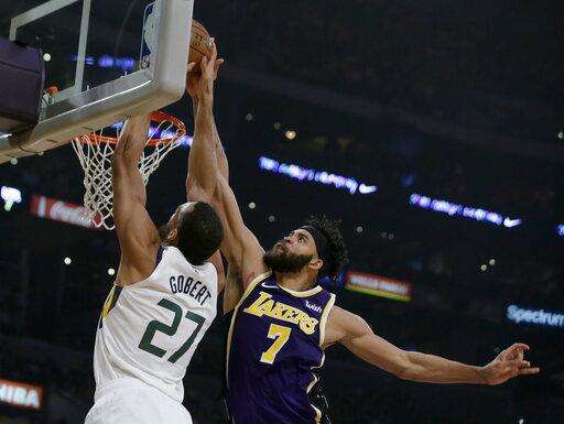 Los Angeles Lakers center JaVale McGee, right, blocks a shot by Utah Jazz center Rudy Gobert during the first half of an NBA basketball game in Los Angeles, Friday, Oct. 25, 2019. (AP Photo/Alex Gallardo) The Associated Press