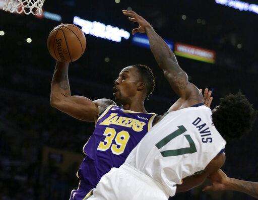 Los Angeles Lakers center Dwight Howard, left, rebounds the ball next to Utah Jazz center Ed Davis during the first half of an NBA basketball game in Los Angeles, Friday, Oct. 25, 2019. (AP Photo/Alex Gallardo) The Associated Press