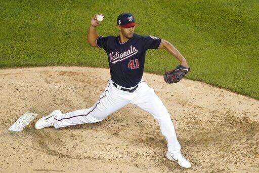 Washington Nationals reliever Joe Ross throws during the seventh inning of Game 3 of the baseball World Series against the Houston Astros Friday, Oct. 25, 2019, in Washington. (AP Photo/Pablo Martinez Monsivais) The Associated Press