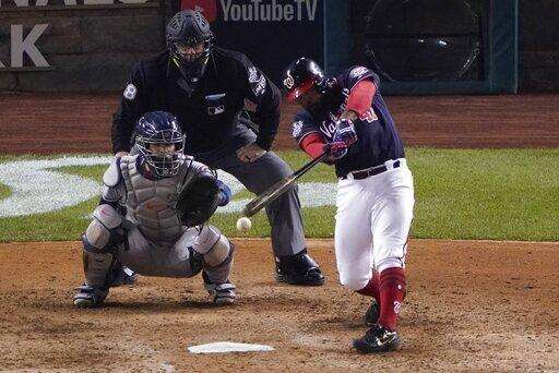 Washington Nationals' Howie Kendrick hits a single during the eighth inning of Game 3 of the baseball World Series against the Houston Astros Friday, Oct. 25, 2019, in Washington. (AP Photo/Alex Brandon) The Associated Press