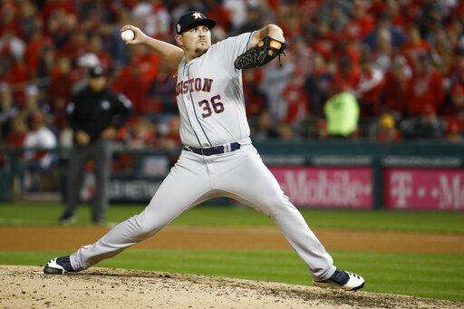 Houston Astros relief pitcher Will Harris throws against the Washington Nationals during the seventh inning of Game 3 of the baseball World Series Friday, Oct. 25, 2019, in Washington. (AP Photo/Patrick Semansky) The Associated Press