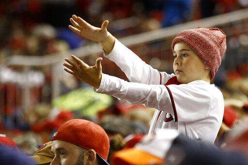 A fan gestures the baby shark as Washington Nationals' Gerardo Parra bats during the sixth inning of Game 3 of the baseball World Series Houston Astros Friday, Oct. 25, 2019, in Washington. (AP Photo/Patrick Semansky) The Associated Press