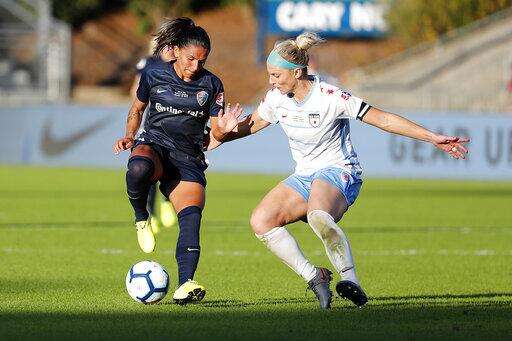 North Carolina Courage's Jaelene Hinkle (15) battles with Chicago Red Stars' Sam Kerr (20) for the ball during the first half of an NWSL championship soccer game in Cary, N.C., Sunday, Oct. 27, 2019. (AP Photo/Karl B DeBlaker)