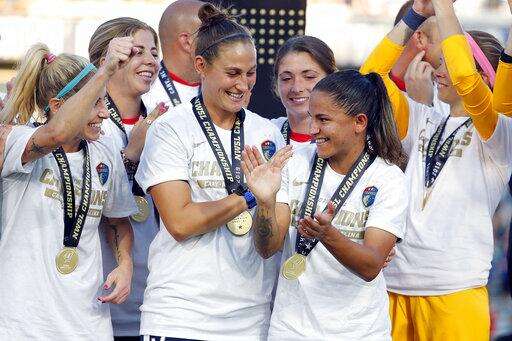 North Carolina Courage's Heather O'Reilly, center, holds the championship trophy following the team's win over the Chicago Red Stars in an NWSL championship soccer game in Cary, N.C., Sunday, Oct. 27, 2019. (AP Photo/Karl B DeBlaker)