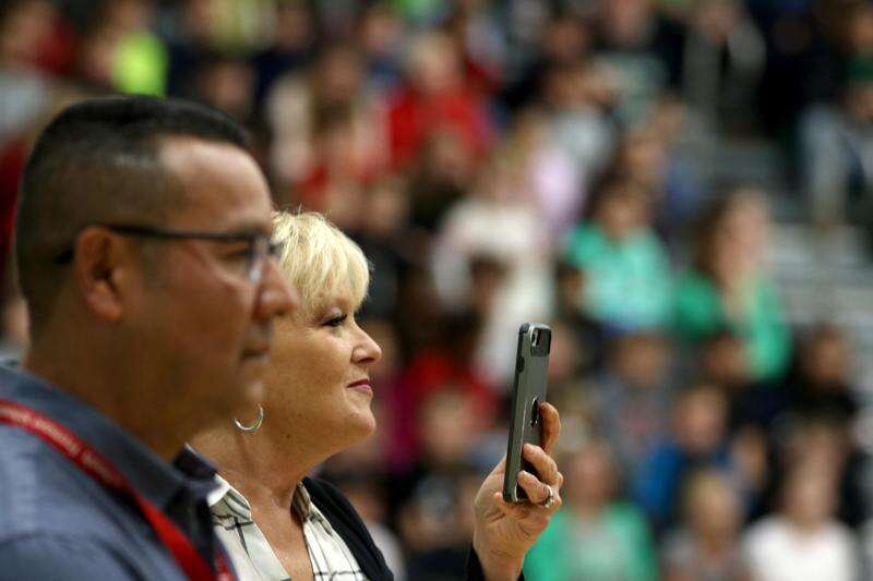 Fremont music and drama teacher Stacey Begg posed more student-generated questions between songs in the gymnasium.