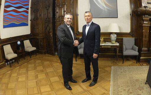In this handout photo provided by Argentina's presidential press office, presidential candidate Alberto Fernandez, left, shakes hands with Argentina's President Mauricio Macri at Government House in Buenos Aires, Argentina, Monday, Oct. 28, 2019. Argentina's Peronists are celebrating their return to power after incumbent Macri conceded defeat in a dramatic election that likely swung the country back to the center-left and threatened to rattle financial markets (Presidencia de la Nacion via AP) The Associated Press
