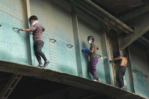 Anti-government protesters climb the Joumhouriya Bridge that leads to the Green Zone government area, during ongoing protests in Baghdad, Iraq, Sunday, Nov. 3, 2019. (AP Photo/Hadi Mizban)