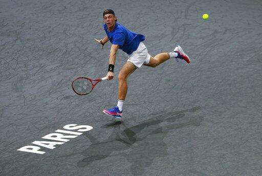 PARIS (AP) - Novak Djokovic looked imperious in beating an overawed Denis Shapovalov 6-3, 6-4 Sunday to win his fifth Paris Masters final, clinching a 34th overall Masters title in fine style to move one behind record holder Rafael Nadal.