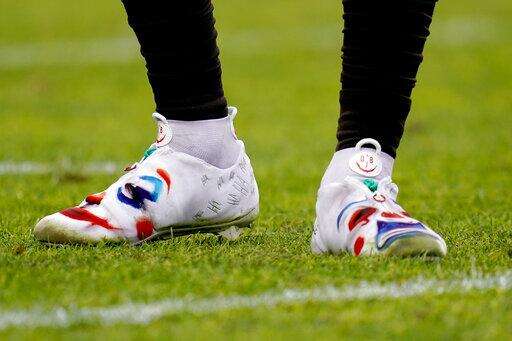 Cleveland Browns wide receiver Jarvis Landry wears a pair of custom cleats during the first half of NFL football game against the Denver Broncos, Sunday, Nov. 3, 2019, in Denver. The NFL made both Landry and Odell Beckham change their cleats at halftime. (AP Photo/Jack Dempsey) The Associated Press