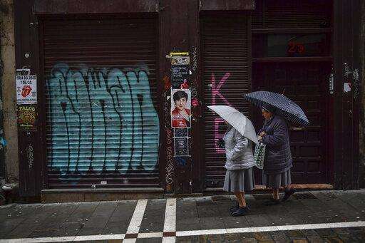 Two nuns shelter under umbrellas while walking past a basque nationalist campaign cartel, center, the day after the general election, in Pamplona, northern Spain, Monday, Nov. 11, 2019. Spain looked set Monday to face political uncertainty for many more months after the country's fourth elections in as many years further complicated an already messy political situation. (AP Photo/Alvaro Barrientos) The Associated Press