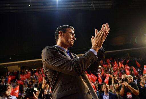 FILE - In this Nov. 1, 2019, file photo, Spain's caretaker Prime Minister and socialist candidate Pedro Sanchez applauds socialist followers during a general election campaign rally in Pamplona, northern Spain. Sanchez's Socialists won Spain's national election on Sunday but large gains by the upstart far-right Vox party appear certain to widen the political deadlock in the European Union's fifth-largest economy. (AP Photo/Alvaro Barrientos, File) The Associated Press