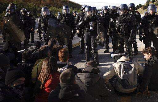 French police officers cordon off the access as pro-Catalan independence demonstrators try to block a major highway border pass near La Jonquera between Spain and France, Monday, Nov. 11, 2019. Protesters following a call to action by a secretive pro-Catalan independence group have closed off both sides of the AP7 highway at the major transportation hub of La Jonquera between France and Spain. (AP Photo/Felipe Dana) The Associated Press