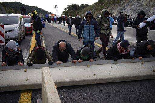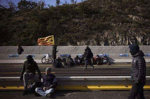 Pro-Catalan independence demonstrators block a major highway border pass near La Jonquera between Spain and France, Monday, Nov. 11, 2019. Protesters following a call to action by a secretive pro-Catalan independence group have closed off both sides of the AP7 highway at the major transportation hub of La Jonquera between France and Spain. (AP Photo/Felipe Dana) The Associated Press