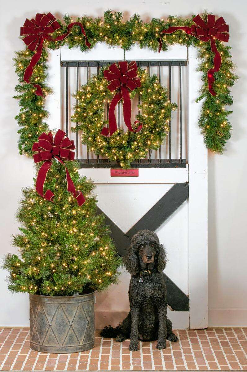 Brighton Pine pre-lit wreaths, garland and tree in a metal drum container help create a "rustic charm" look. Photos courtesy of Treetime Christmas Creations