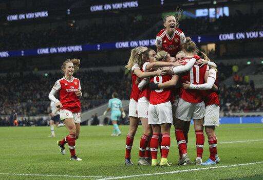 Arsenal celebrate after Vivanne Miedema scores her sides second goal of the match against Tottenham Hotspur during their Women's Super League soccer match at the Tottenham Hotspur Stadium in London, Sunday Nov. 17, 2019. The match drew a record crowd of 38,262 for the competition on Sunday when Arsenal claimed a 2-0 victory at Tottenham. (Zac Goodwin/PA via AP) The Associated Press