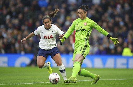 Tottenham Hotspur's Kit Graham, left, and Arsenal's goalie Manuela Zinsberger in action during their Women's Super League soccer match at the Tottenham Hotspur Stadium in London, Sunday Nov. 17, 2019. The match drew a record crowd of 38,262 for the competition on Sunday when Arsenal claimed a 2-0 victory at Tottenham. (Zac Goodwin/PA via AP) The Associated Press