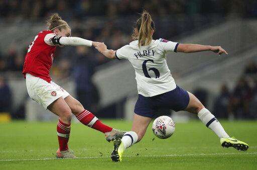 Arsenal's Kim Little, left, scores her sides first goal of the match against Tottenham Hotspur, during their Women's Super League soccer match at the Tottenham Hotspur Stadium in London, Sunday Nov. 17, 2019. The match drew a record crowd of 38,262 for the competition on Sunday when Arsenal claimed a 2-0 victory at Tottenham. (Zac Goodwin/PA via AP) The Associated Press