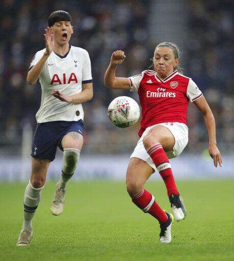 Tottenham Hotspur's Ashleigh Neville, left, and Arsenal's Katie Mccabe battle for the ball during their Women's Super League soccer match at the Tottenham Hotspur Stadium in London, Sunday Nov. 17, 2019. The match drew a record crowd of 38,262 for the competition on Sunday when Arsenal claimed a 2-0 victory at Tottenham. (Zac Goodwin/PA via AP) The Associated Press
