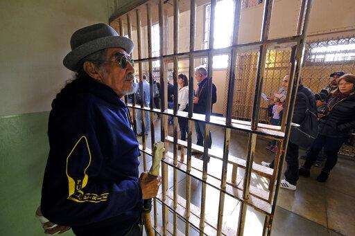 In this photo taken Tuesday, Nov. 12, 2019, Eloy Martinez, who took part in the Native American occupation of Alcatraz 50 years earlier, stands in the cell that he used to sleep in and looks out at tourists visiting the island in San Francisco. The week of Nov. 18, 2019, marks 50 years since the beginning of a months-long Native American occupation at Alcatraz Island in the San Francisco Bay. The demonstration by dozens of tribal members had lasting effects for tribes, raising awareness of life on and off reservations, galvanizing activists and spurring a shift in federal policy toward self-determination. (AP Photo/Eric Risberg)