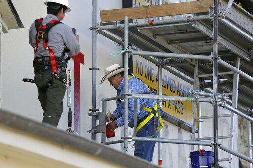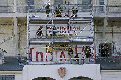 Eloy Martinez, on the center scaffolding, who took part in the original Native American occupation, waves while helping to repaint and restore messages painted above the main dock on Alcatraz Island Wednesday, Nov. 20, 2019, in San Francisco. About 150 people gathered at Alcatraz to mark the 50th anniversary of a takeover of the island by Native American activists. Original occupiers, friends, family and others assembled Wednesday morning for a program that included prayer, songs and speakers. They then headed to the dock to begin restoring messages painted by occupiers on a former barracks building. (AP Photo/Eric Risberg)