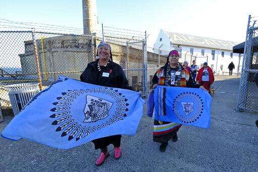 Theda New Breast, left, and Aurora Mamea, of the Blackfeet Nation in Montana, make their way to ceremonies for the 50th anniversary of the Native American occupation of Alcatraz Island Wednesday, Nov. 20, 2019, in San Francisco. About 150 people gathered at Alcatraz to mark the 50th anniversary of a takeover of the island by Native American activists. Original occupiers, friends, family and others assembled Wednesday morning for a program that included prayer, songs and speakers. They then headed to the dock to begin restoring messages painted by occupiers on a former barracks building. (AP Photo/Eric Risberg)