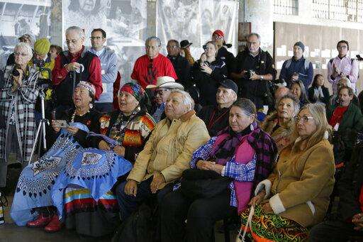 Sacheen Littlefeather, second from right in the front row, listens to ceremonies marking the 50th anniversary of the Native American occupation of Alcatraz Island Wednesday, Nov. 20, 2019, in San Francisco. About 150 people gathered at Alcatraz to mark the 50th anniversary of a takeover of the island by Native American activists. Original occupiers, friends, family and others assembled Wednesday morning for a program that included prayer, songs and speakers. They then headed to the dock to begin restoring messages painted by occupiers on a former barracks building. In 1973 Littlefeather represented Marlon Brando at the Oscars to decline his Best Actor award. (AP Photo/Eric Risberg)
