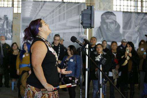 Kanyon Sayers-Woods sings during ceremonies marking the 50th anniversary of the Native American occupation on Alcatraz Island Wednesday, Nov. 20, 2019, in San Francisco. About 150 people gathered at Alcatraz to mark the 50th anniversary of a takeover of the island by Native American activists. Original occupiers, friends, family and others assembled Wednesday morning for a program that included prayer, songs and speakers. They then headed to the dock to begin restoring messages painted by occupiers on a former barracks building. (AP Photo/Eric Risberg)