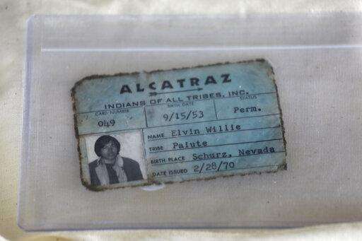 An Indians of All Tribes identification card is on display as part of an exhibit marking the 50th anniversary of the Native American occupation on Alcatraz Island Wednesday, Nov. 20, 2019, in San Francisco. About 150 people gathered at Alcatraz to mark the 50th anniversary of a takeover of the island by Native American activists. Original occupiers, friends, family and others assembled Wednesday morning for a program that included prayer, songs and speakers. They then headed to the dock to begin restoring messages painted by occupiers on a former barracks building. (AP Photo/Eric Risberg)