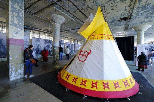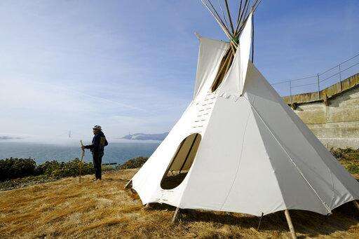 People make their way past a teepee and large photographs that are part of an exhibit for the 50th anniversary of the Native American occupation on Alcatraz Island Wednesday, Nov. 20, 2019, in San Francisco. About 150 people gathered at Alcatraz to mark the 50th anniversary of a takeover of the island by Native American activists. Original occupiers, friends, family and others assembled Wednesday morning for a program that included prayer, songs and speakers. They then headed to the dock to begin restoring messages painted by occupiers on a former barracks building. (AP Photo/Eric Risberg)