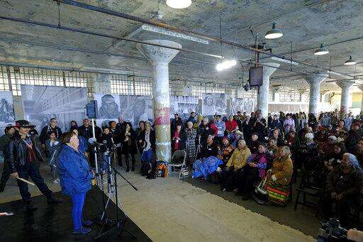 Ruth Orta leads a prayer during ceremonies for the 50th anniversary of the Native American occupation of Alcatraz Island Wednesday, Nov. 20, 2019, in San Francisco. About 150 people gathered at Alcatraz to mark the 50th anniversary of a takeover of the island by Native American activists. Original occupiers, friends, family and others assembled Wednesday morning for a program that included prayer, songs and speakers. They then headed to the dock to begin restoring messages painted by occupiers on a former barracks building. Orta was one of the original occupiers. (AP Photo/Eric Risberg)