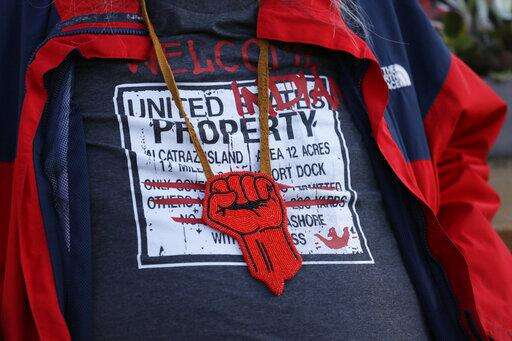 Tyrone Herbert Simmons, of Auburn, Wash., wears a red fist necklace while waiting to board a boat to attend ceremonies marking the 50th anniversary of the Native American occupation on Alcatraz Island Wednesday, Nov. 20, 2019, in San Francisco. About 150 people gathered at Alcatraz to mark the 50th anniversary of a takeover of the island by Native American activists. Original occupiers, friends, family and others assembled Wednesday morning for a program that included prayer, songs and speakers. They then headed to the dock to begin restoring messages painted by occupiers on a former barracks building. (AP Photo/Eric Risberg)