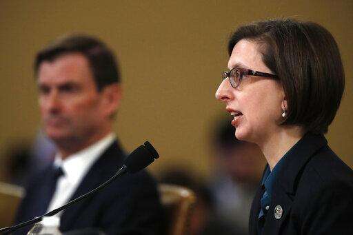 Deputy Assistant Secretary of Defense Laura Cooper, and State Department official David Hale, right, testify before the House Intelligence Committee on Capitol Hill in Washington, Wednesday, Nov. 20, 2019, during a public impeachment hearing of President Donald Trump's efforts to tie U.S. aid for Ukraine to investigations of his political opponents. (AP Photo/Alex Brandon) The Associated Press