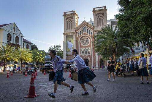 School children run in the courtyard of Assumption Cathedral, decorated with posters of Pope Francis in Bangkok, Thailand, Wednesday, Nov. 20, 2019. Pope Francis arrives in Thailand on Wednesday for the first visit here by the head of the Roman Catholic Church since St. John Paul II in 1984. (AP Photo/Gemunu Amarasinghe) The Associated Press