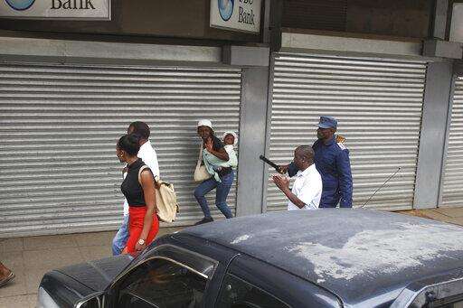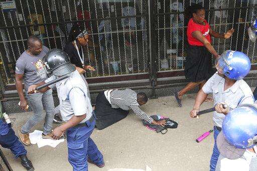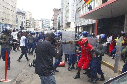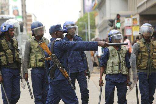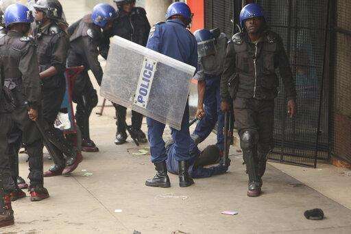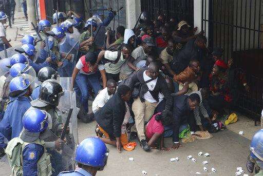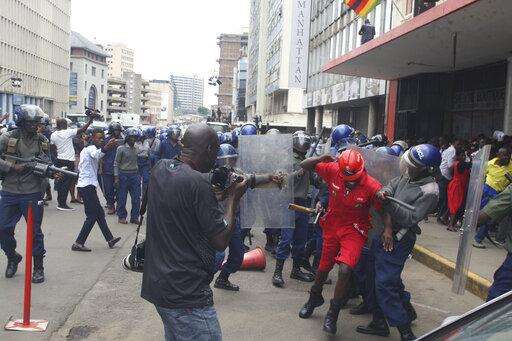 HARARE, Zimbabwe (AP) - Zimbabwe police with riot gear fired tear gas and struck people who gathered on Wednesday to hear a speech by the country's top opposition leader amid growing frustration with the collapsing economy.
