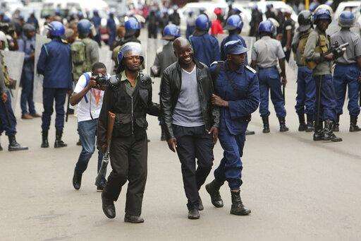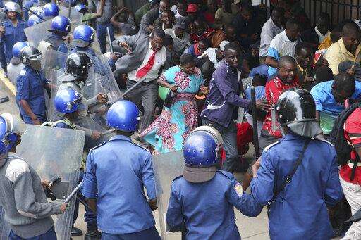Police surround opposition party supporters who had gathered to hear a speech by the country's top opposition leader in Harare, Wednesday, Nov. 20, 2019. Zimbabwean police with riot gear fired tear gas and struck people who had gathered at the opposition party headquarters to hear a speech by the main opposition leader Nelson Chamisa who still disputes his narrow loss to Zimbabwean President Emmerson Mnangagwa. (AP Photo/Tsvangirayi Mukwazhi)