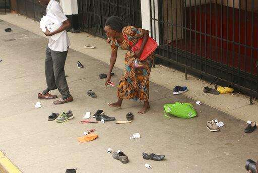 Opposition party supporters pick up their belonging after being surrounded by police officers as they waited to hear a speech by the country's top opposition leader in Harare, Wednesday, Nov. 20, 2019. Zimbabwean police with riot gear fired tear gas and struck people who had gathered at the opposition party headquarters to hear a speech by the main opposition leader Nelson Chamisa who still disputes his narrow loss to Zimbabwean President Emmerson Mnangagwa. (AP Photo/Tsvangirayi Mukwazhi)