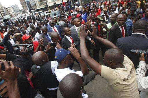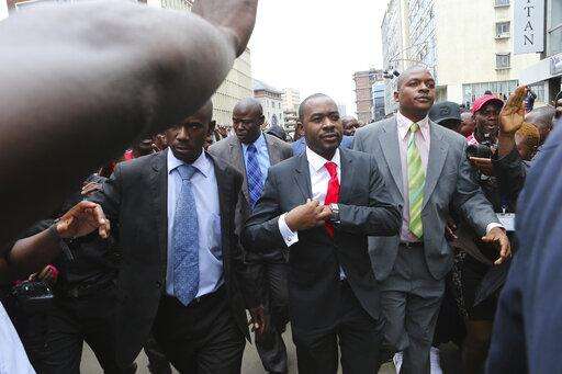 Zimbabwe top opposition leader Nelson Chamisa, center, arrives to deliver his speech at the party headquarters in Harare, Wednesday, Nov. 20, 2019. Zimbabwean police with riot gear fired tear gas and struck people who had gathered at the opposition party headquarters to hear a speech by the main opposition leader Nelson Chamisa who still disputes his narrow loss to Zimbabwean President Emmerson Mnangagwa. (AP Photo/Tsvangirayi Mukwazhi)