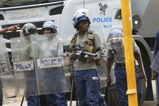 Police officers stand by as opposition party supporters gathered to hear a speech by the country's top opposition leader in Harare, Wednesday, Nov, 20, 2019. Zimbabwean police with riot gear fired tear gas and struck people who had gathered at the opposition party headquarters to hear a speech by the main opposition leader Nelson Chamisa who still disputes his narrow loss to Zimbabwean President Emmerson Mnangagwa. (AP Photo/Tsvangirayi Mukwazhi)