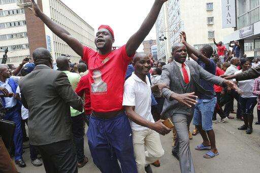 Opposition party suppoters sing and dance while waiting to hear a speech by the country's top opposition leader in Harare, Wednesday, Nov. 20, 2019. Zimbabwean police with riot gear fired tear gas and struck people who had gathered at the opposition party headquarters to hear a speech by the main opposition leader Nelson Chamisa who still disputes his narrow loss to Zimbabwean President Emmerson Mnangagwa. (AP Photo/Tsvangirayi Mukwazhi)