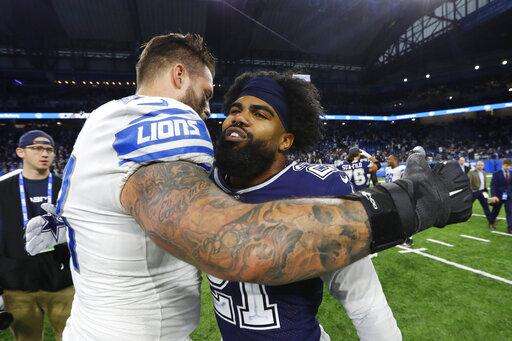 Detroit Lions offensive tackle Taylor Decker, left, hugs Dallas Cowboys running back Ezekiel Elliott (21) after an NFL football game, Sunday, Nov. 17, 2019, in Detroit. (AP Photo/Paul Sancya) The Associated Press