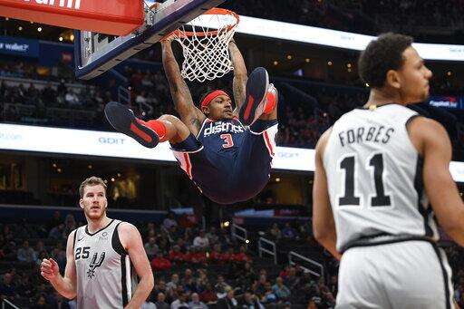 Washington Wizards guard Bradley Beal (3) hangs from the rim after his dunk between San Antonio Spurs center Jakob Poeltl (25) and guard Bryn Forbes (11) during the first half of an NBA basketball game Wednesday, Nov. 20, 2019, in Washington. (AP Photo/Nick Wass) The Associated Press