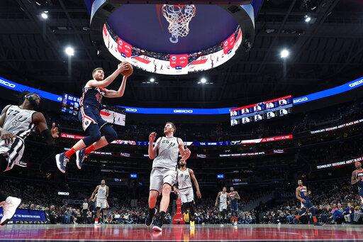 Washington Wizards forward Davis Bertans (42) goes to the basket past San Antonio Spurs forward DeMarre Carroll (77) and center Jakob Poeltl (25) during the second half of an NBA basketball game Wednesday, Nov. 20, 2019, in Washington. The Wizards won 138-132. (AP Photo/Nick Wass) The Associated Press