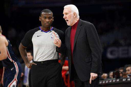San Antonio Spurs coach Gregg Popovich, right, gestures next to an official during the second half of the team's NBA basketball game against the Washington Wizards on Wednesday, Nov. 20, 2019, in Washington. The Wizards won 138-132. (AP Photo/Nick Wass) The Associated Press