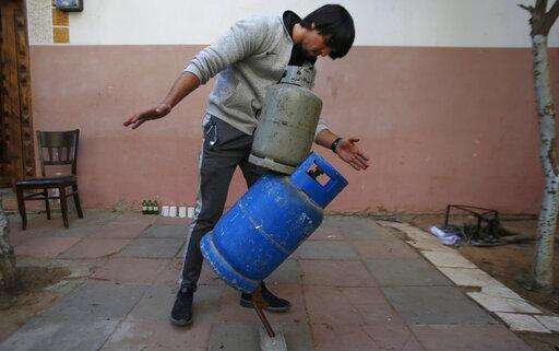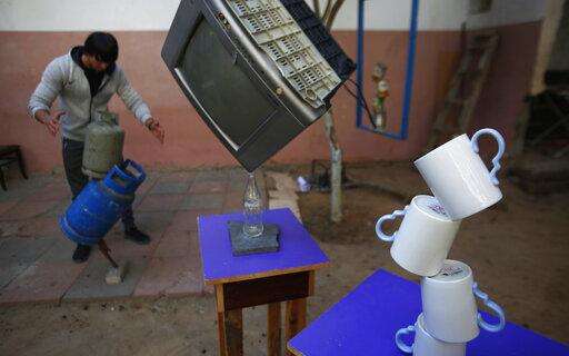 In the yard of his home in northern Gaza, al-Shenbari stood a chair on one leg, propped two gas canisters on a slanted pipe wrench and balanced an upside-down TV screen on the rim of a Coke bottle.