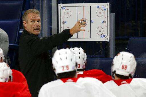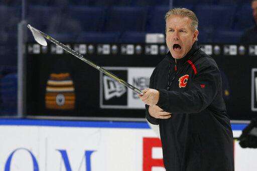 Calgary Flames associate coach Geoff Ward gives instruction during an NHL hockey practice Tuesday, Nov. 26, 2019, in Buffalo, N.Y. Flames general manager Brad Treliving says coach Bill Peters remains on the staff but wasn't certain whether he'd be behind the bench for the next game. The team and the NHL are both investigating an allegation the Peters directed racial slurs at a player 10 years ago when the two were in the minors. Akim Aliu, a Nigerian-born player, says Peters 'œdropped the N bomb several times' in a dressing room during his rookie year. (AP Photo/Jeffrey T. Barnes) The Associated Press